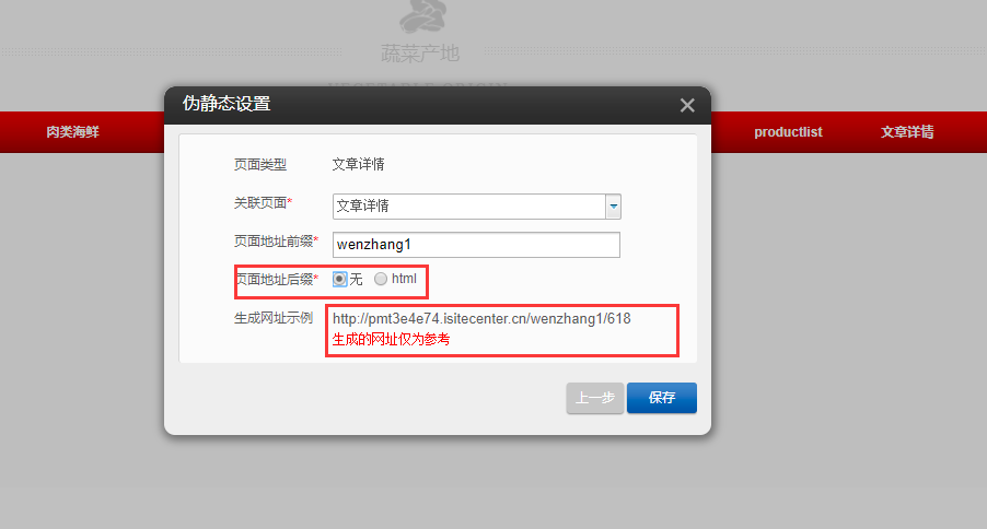 1.以PC端文章详情为例,首先在编辑器中点击“设置”-“伪静态设置”,点击“添加伪静态规则”,选择页面类型“文章详情”或者“产品详情”,选择关联页面并填写页面地址前缀,都为必填项,页面地址后缀可二选一,填写完成后点击保存即可,如图所示: